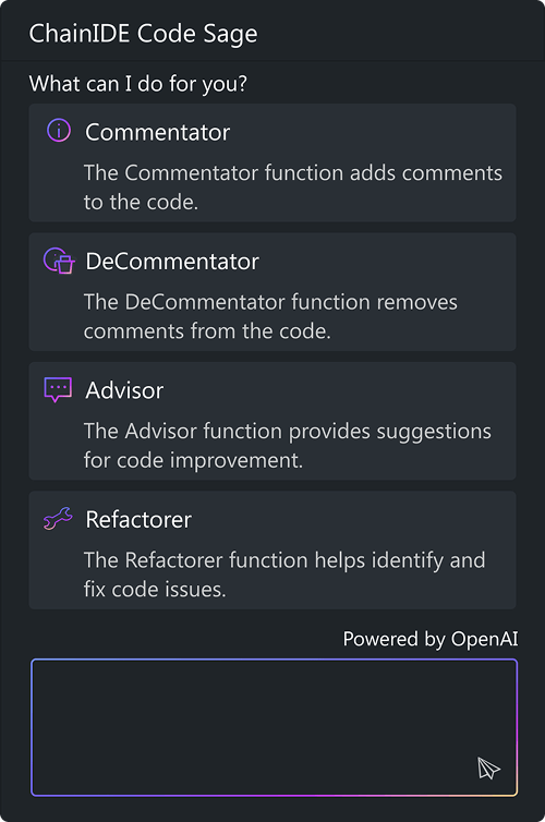 ChainIDE Code Sage, powered by OpenAI, intelligently enhances coding efficiency by answering code-related questions.